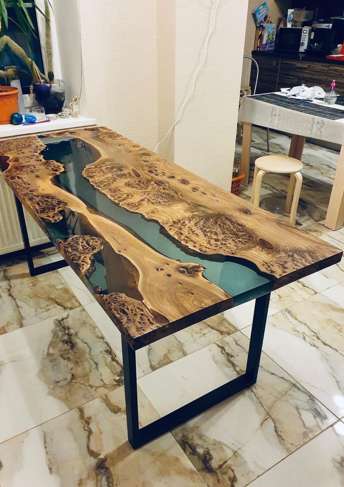 Слэбы с естественными трещинами и ""рекой"" из цветной смолы делают каждый стол произведением искусства. Материалы устойчивы к влаге и температуре, а индивидуальный дизайн подчеркнёт статус заведения.